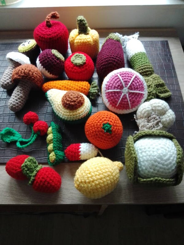 Lot de dinette jouets lavable crochet comprends une aubergine une pomme une carotte une ail un poireau un poivron un kiwi un navet un demi avocat un pamplemousse 2 fraises 2 champignons un radis un chou petit pois une orange une tomate un citron une paire de cerises